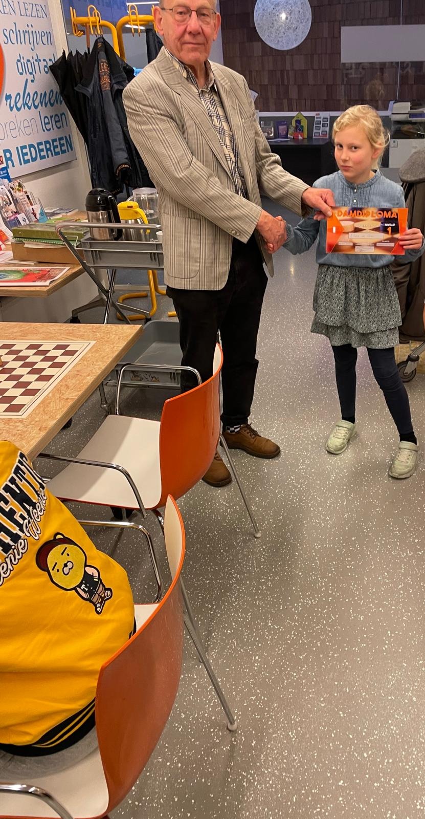 Zo heeft de 10 -jarige Elisa uit Winschoten zich een paar maanden geleden aangesloten bij de jeugdafdeling van Damclub Winschoten en is begonnen met het cursusboek niveau 1 dat opgaat voor een bijbehorend damdiploma. Deze cursus behandelt in eerste instantie de spelregels, zoals hoe moet het dambord liggen, links onder een donker vakje. Beide spelers beginnen met 20 witte en 20 zwarte damstenen, waarbij wit altijd begint. Om en om wordt dan een zet gedaan, waarbij slaan verplicht is, ook achteruit. Maar, damslag gaat niet voor, die keuze ligt bij de speler die aan zet is. M.a.w. of slaan met de schijf of slaan met de dam. Verzuimd een speler te slaan dan pas mag de tegenspeler je daar attent op maken. Meerslag gaat wel voor. Als een schijf de overkant bereikt en daar eindigt wordt het een dam. Slaat de schijf verder dan blijft het een schijf. Nadat een combinatie is uitgevoerd mogen de geslagen schijven van het bord genomen, daarbij mag een dam slechts één keer over dezelfde schijf slaan. Een mooi voorbeeld hiervan is de Coup Turc. Ook aan de belangrijkste regel: aanraken is zetten wordt aandacht besteed. Overigens, voordat de partij begint wens je de tegenstander succes. Het cursusboek gaat verder met aanvallen, achterlopen, ruilen, offeren en oppositie. Daarnaast wordt geoefend met eenvoudige combinaties en afgesloten met vangstellingen. Na het maken van een geslaagd proefexamen is Elisa woensdag 19 november begonnen met het examen van de Koninklijke Nederlandse Dambond (KNDB) en is met een 100% score geslaagd. Na afloop mocht Elisa het daarbij behorende diploma in ontvangst nemen uit handen van Geert Lubberink.