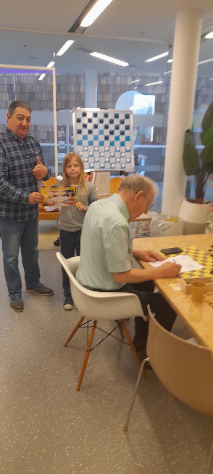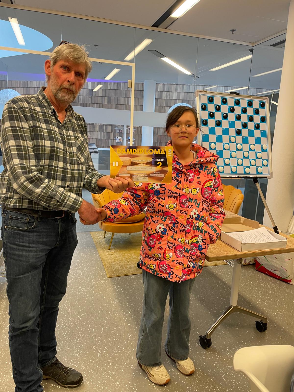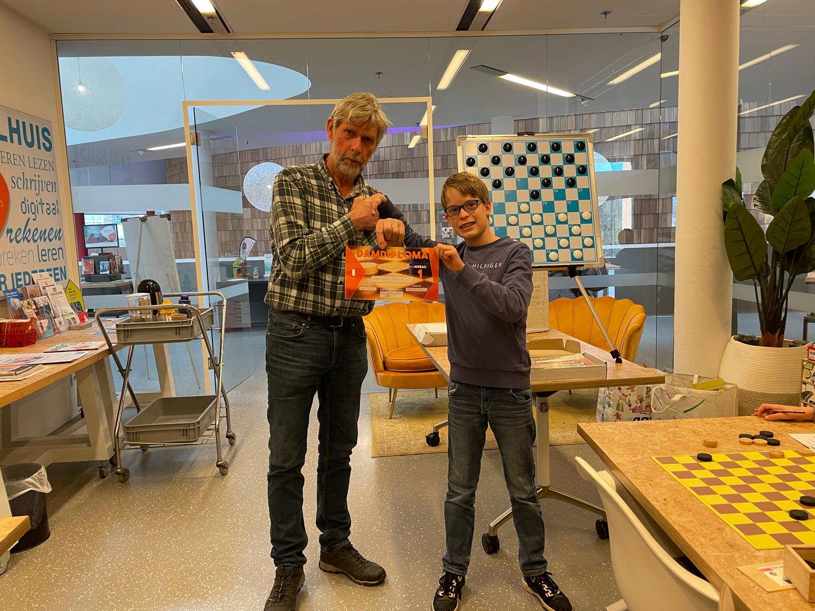 Damclub Winschoten zetelt sinds oktober 2022 in de “cursusruimte” van de bibliotheek Winschoten en heeft met 18 leden een gezonde jeugdafdeling. Dit is overigens een samenwerkingsverband tussen bibliotheek Winschoten en Damclub Winschoten. De jeugd begint, als basis, met een ½ uur werken in het cursusboek. Daarna gezamenlijk theorie op het zogenaamde demonstratiebord om daarna een onderlinge wedstrijd te spelen. Wanneer een cursus is afgerond gaat het jeugdlid op voor het zogenaamde “proefexamen”. Bij een goed resultaat, maakt het jeugdlid vervolgens het examen van de KNDB. Is deze score voldoende dan volgt de uitreiking van het bijbehorende diploma. Woensdagmiddag 1 april was het dan zover en mochten Lennard, Evelyn en Moos hun damdiploma in ontvangst nemen.